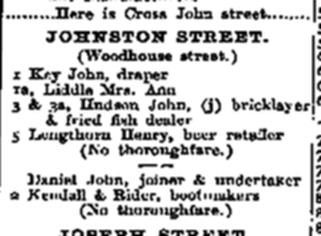 First mention (in a street directory) of a “fried fish dealer” next door to the Chemic Tavern